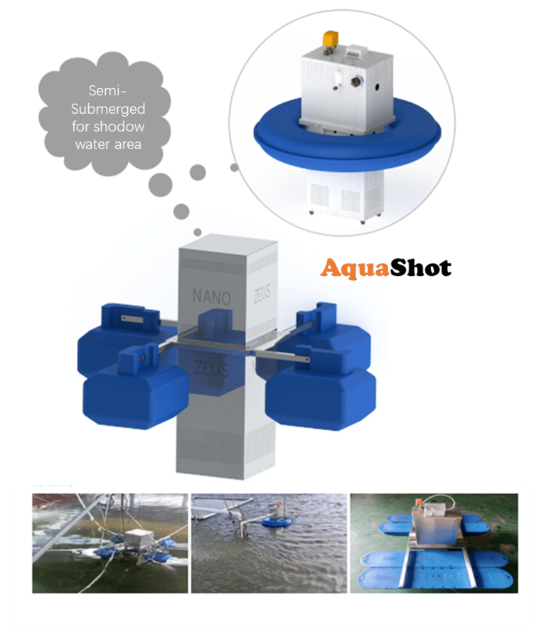 Semi-submerged design for efficient lake & pond, aquaculture and oxidation pond wastewater treatment applications.